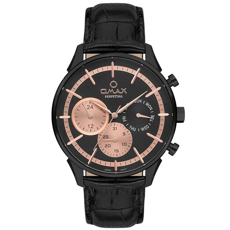 این طرح از ساعت مچی های مردانه برند ساعت اوماکس با طراحی و رنگ خاص خود برای تیپهای اسپرت بسیار مناسب می باشد. بند این ساعت چرم و بدنه ی این طرح از برند اوماکس از جنس استیل است و از رنگ های رزگلد و مشکی در آن استفاده شده است. از ویژگیهای منحصر به فرد این ساعت میتوان به طراحی بسیار شیک ساعت در عین سادگی آن اشاره کرد. این ساعت فول دیت بوده و عقربه های کوچک تعبیه شده در آن نمایشگر روزهای ماه و هفته و وضعیت 24 ساعته ساعت می باشد.