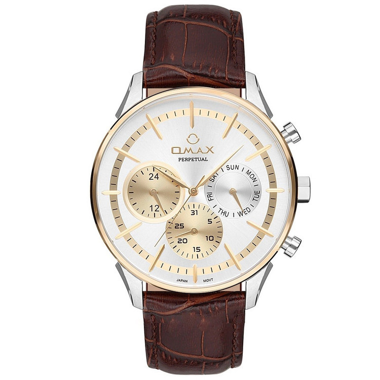 این طرح از ساعت مچی های مردانه برند ساعت اوماکس با طراحی و رنگ خاص خود برای تیپهای اسپرت بسیار مناسب می باشد. بند این ساعت چرم و بدنه ی این طرح از برند اوماکس از جنس استیل است و از رنگ های قهوه ای و طلایی و نقره ای در آن استفاده شده است. از ویژگیهای منحصر به فرد این ساعت میتوان به طراحی بسیار شیک ساعت در عین سادگی آن اشاره کرد. این ساعت فول دیت بوده و عقربه های کوچک تعبیه شده در آن نمایشگر روزهای ماه و هفته و وضعیت 24 ساعته ساعت می باشد.